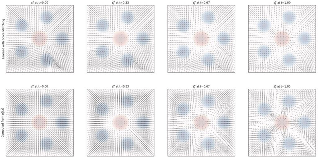 Flow matching переформулирует задачу в терминах непрерывной динамики. Вместо дискретных шагов диффузии мы определяем непрерывное векторное поле скоростей, которое переносит распределение шума в распределение данных. А нейросеть учится предсказывать это поле скоростей. Математически это эквивалентно решению обыкновенного дифференциального уравнения, что позволяет использовать численные методы, разрабатывавшиеся в этой науке столетиями, и в результате порождать изображения за гораздо меньшее число шагов.