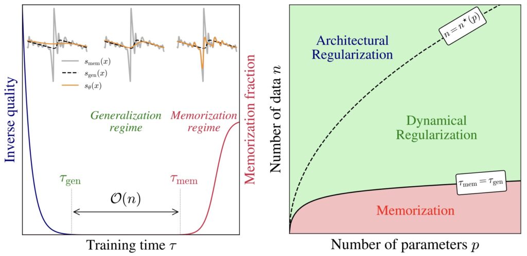 Ответ оказался красивым: сам процесс итеративного денойзинга действует как неявный регуляризатор. Используя теорию случайных матриц, авторы нашли в обучении два этапа: фаза обобщения, не зависящая от размера датасета, за которой следует фаза запоминания, линейно зависящая от размера данных.