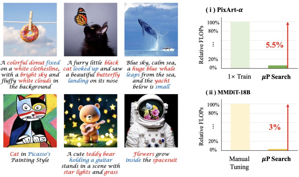 Другая интересная и важная — улучшение эффективности обучения через перенос гиперпараметров (Zheng et al., май 2025). Они обобщили технику Maximal Update Parametrization (μP), которая позволяет переносить гиперпараметры от маленьких моделей к большим, с обычных LLM, для которых она изначально предназначалась (см., например, этот обзор) на архитектуры DiT. В результате DiT-XL-2-μP сходится в 2.9 раза быстрее, а масштабирование MMDiT с 0.18B до 18B параметров потребовало всего 3% от обычных затрат на дообучение:
