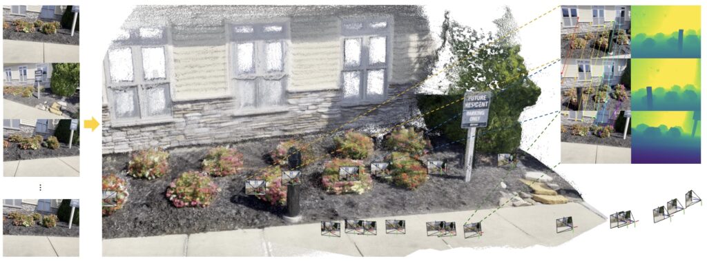 Так, best paper получила работа “VGGT: Visual Geometry Grounded Transformer” от команды Oxford VGG и Meta AI (Wang et al., март 2025). Чтобы понять, почему это важно, нужно немного контекста. Традиционная 3D-реконструкция из нескольких 2D-изображений — это сложный многостадийный пайплайн: калибровка камер, сопоставление признаков между кадрами, bundle adjustment (совместная оптимизация позиций камер и 3D-структуры) и так далее. На каждом этапе могут накапливаться ошибки, каждый требует тщательной настройки.