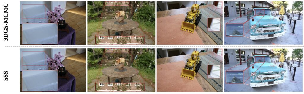 А Honourable Mention на CVPR получила работа “3D Student Splatting and Scooping” (SSS; Zhu et al., март 2025). Авторы исправили две главные проблемы 3DGS: тенденцию к переобучению с избыточным числом гауссианов и сложности с высокодетализированными структурами. В SSS вводится операция scooping, которая удаляет лишние гауссианы, а сеть-ученик обучается строить более эффективное представление:
