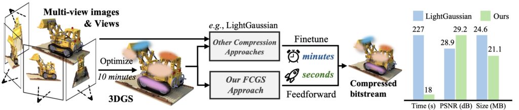 Например, метод HAC++ (Chen et al., январь 2025) достигает 100-кратного сжатия через моделирование контекста на hash grids, а FCGS (Fast Feedforward 3DGS Compression; Chen et al., Jan 2025) сжимает в 10 раз быстрее предыдущих методов, не требуя при этом решать задачи оптимизации: