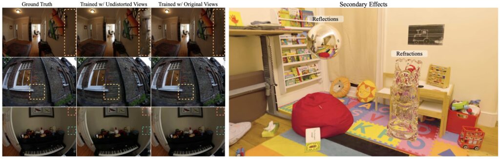 Модель 3DGUT от NVIDIA (Wu et al., март 2025) поддерживает искажённые камеры (fisheye, rolling shutter) и вторичные лучи (отражения), давая при этом 250+ FPS через Unscented Transform: