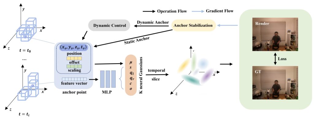 Временные расширения 3DGS позволяют захватывать и динамические, изменяющиеся во времени сцены. Например, Anchored 4D Gaussian Splatting (Li et al., декабрь 2025) использует якорные точки для регуляризации временных атрибутов гауссианов: