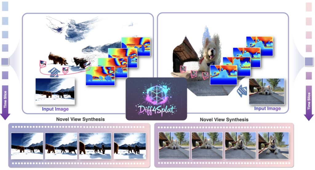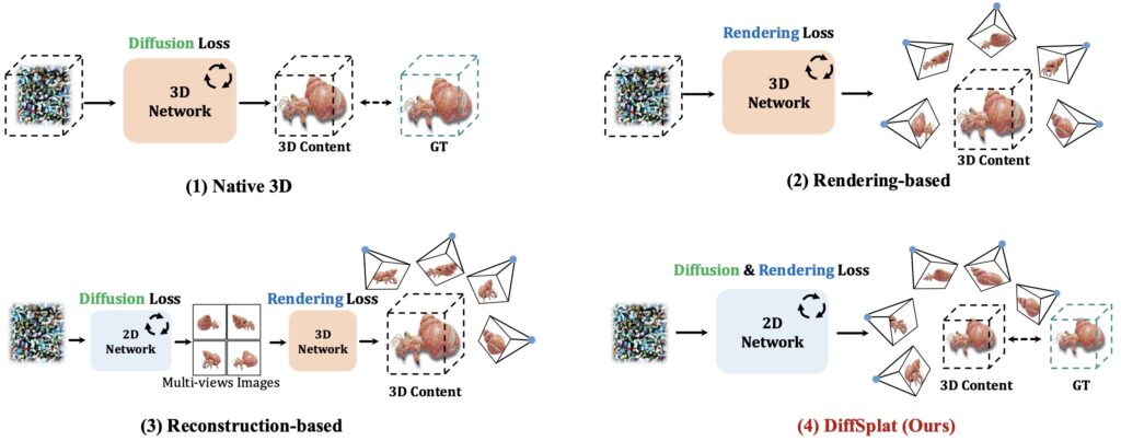 DiffSplat (Lin et al., январь 2025) генерирует 3D-гауссианы напрямую из text-to-image диффузионных моделей за 1-2 секунды, предлагая специальный 3D rendering loss для того, чтобы поддерживать соответствие между разными видами: