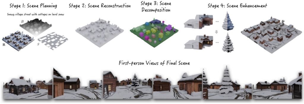Например, модель WorldGen (Wang et al., ноябрь 2025) пытается делать полноценное порождение целых 3D-миров по текстовому запросу, создавая среды размеров 50х50 виртуальных метров, по которым можно потом реально передвигаться: