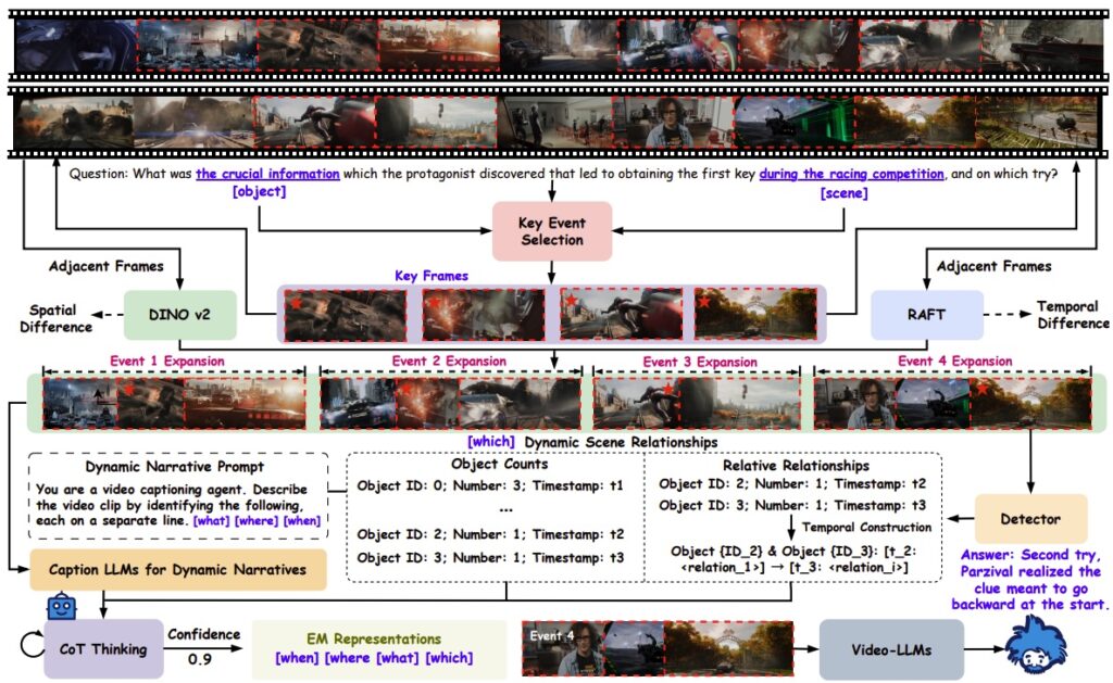 Интересная работа Video-EM (Wang et al., август 2025) комбинирует идеи эпизодической памяти человека и video reasoning с chain-of-thought для работы с длинным контекстом: