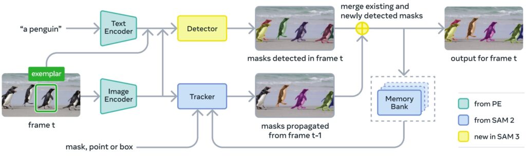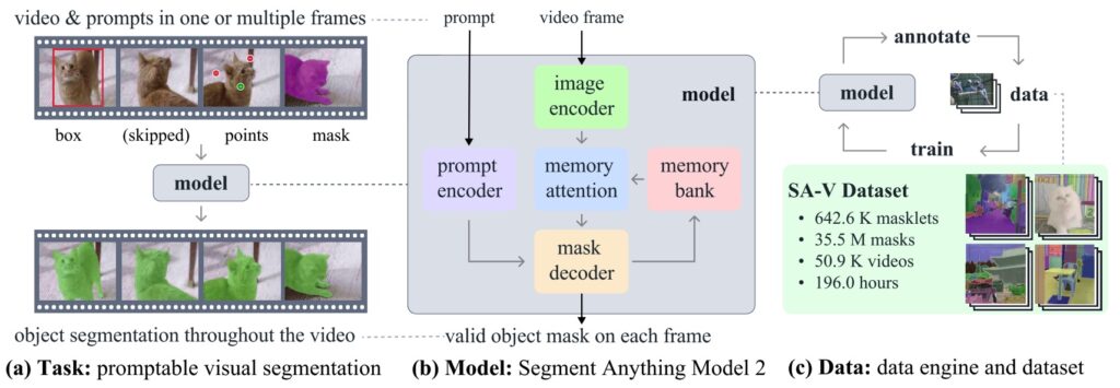 SAM 2 (Ravi et al., январь 2025) расширил сегментацию на видео, добавив в архитектуру потоковую память, что сделало инференс в 6 раз быстрее. Они также выложили датасет SA-V с 50.9K видео и 35.5M масок сегментации.