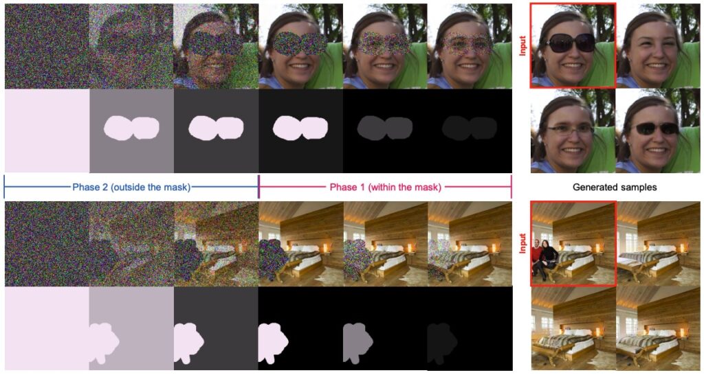 Здесь просто упомяну пару интересных работ. Region-Aware Diffusion (RAD; Kim et al., CVPR 2025) — это вариант диффузионного процесса, в котором диффузия идёт по-разному в разных регионах изображения, что сильно ускоряет редактирование изображений:
