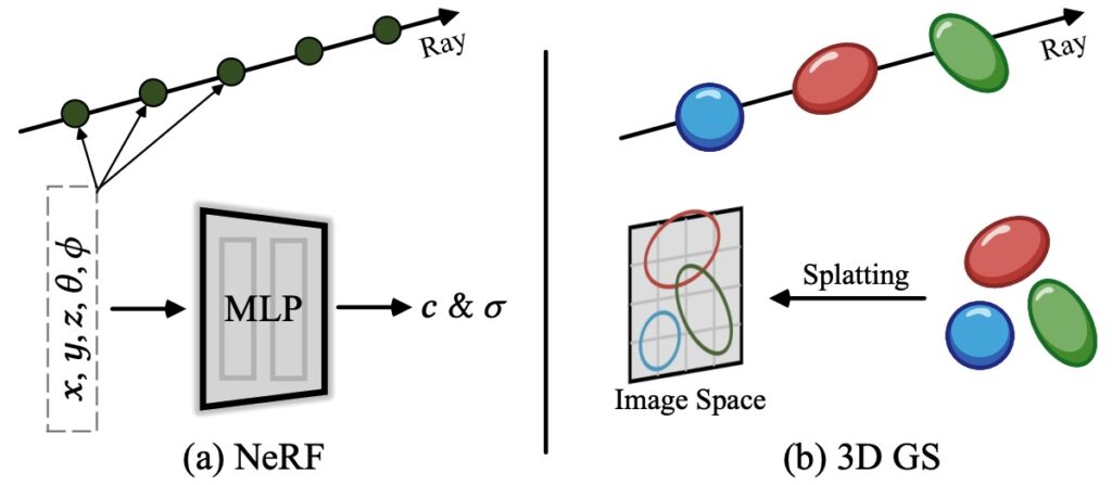 3D Gaussian Splatting представляет сцену как облако трёхмерных гауссианов — “размытых” точек, задаваемых центром, матрицей ковариаций, цветом и прозрачностью. Вот наглядное сравнение из давнего обзора Chen, Wang (2024):