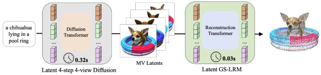 Turbo3D (CVPR 2025, Hu et al., декабрь 2024) может порождать 3D-сцены менее чем за секунду: по сути это четырёхшаговая, 4-view (с четырёх видов) диффузия плюс реконструкция гауссианов в латентном пространстве. Использованные там методы обучения (dual-teacher distillation) обеспечивают и консистентность между разными видами, и (насколько это возможно) фотореалистичность: