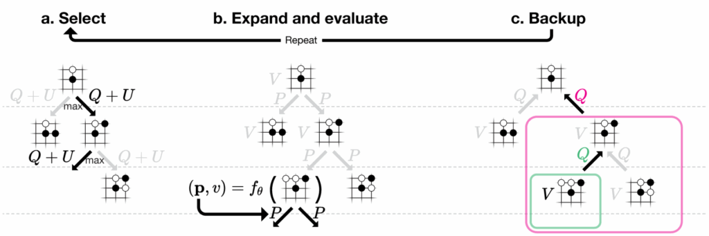 Здесь стоит остановиться подробнее. Вы наверняка помните, как AlphaZero использовал Monte Carlo Tree Search (MCTS) для игры в го и шахматы: