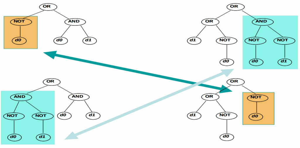 То же самое можно попытаться сделать и с алгоритмами. В обычном генетическом программировании это бы значило взять два синтаксических дерева и перемешать; вот иллюстрация из классического обзора Tettamanzi (2005):