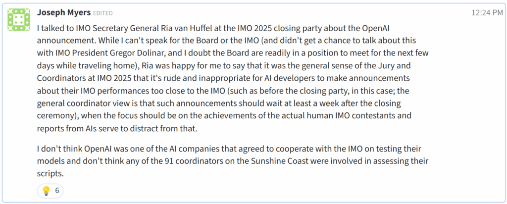 Джозеф Майерс, координатор шестой задачи (единственной, которую модель OpenAI не решила), поделился мнением жюри: “Общее мнение жюри и координаторов IMO заключается в том, что это было грубо и неуместно”.