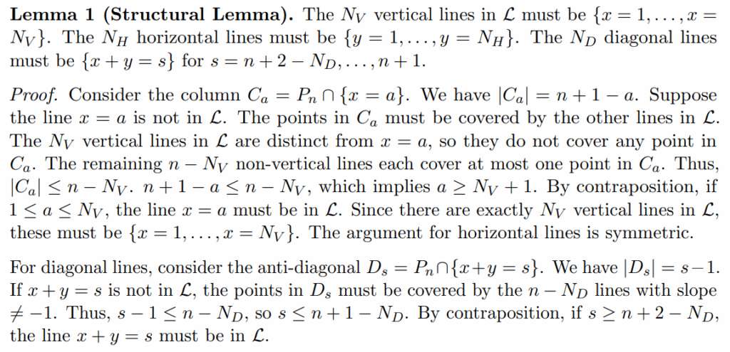 ℓ∩T_n is empty / point / segment. If ℓ doesn’t contain whole side (that’s assumption), then ℓ∩∂T_n has at most two points (if segment, two endpoints). So: any line not equal to a side contains at most 2 points of boundary of T_n.So each ℓ_i contains at most 2 points of B_n. So n lines cover at most 2n boundary points. But must cover all B_n (subset of P_n). Need 2n >= |B_n|=3n-3. For n>=4, 3n-3 >2n (difference n-3>0), impossible. Contradiction. So for n>=4, in any n-line cover of P_n, at least one of three side lines H_n, V_n, D_n is present. Exactly lemma. Good. (that’s main structural lemma)