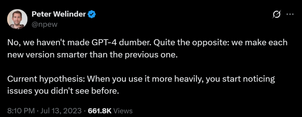 Питер Велиндер из OpenAI попытался объяснить ситуацию: “Мы не делали GPT-4 глупее. Совсем наоборот: мы делаем каждую новую версию умнее предыдущей. Наша текущая гипотеза такова: когда вы больше используете модель, вы начинаете замечать проблемы, которые раньше не видели”.