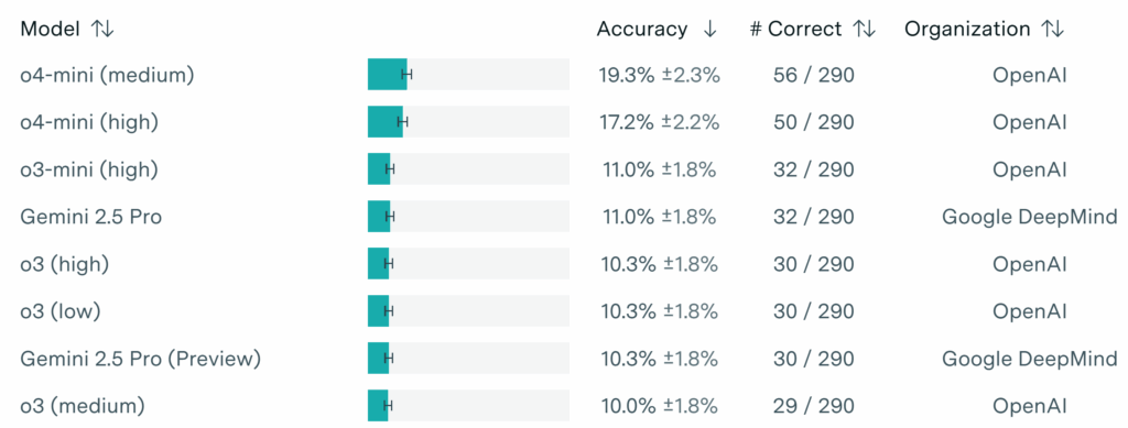Потом o4-mini показала себя гораздо лучше, и сейчас у датасета FrontierMATH две верхние строчки с огромным отрывом занимают модели OpenAI, да и дальше только Gemini 2.5 Pro может как-то конкурировать:
