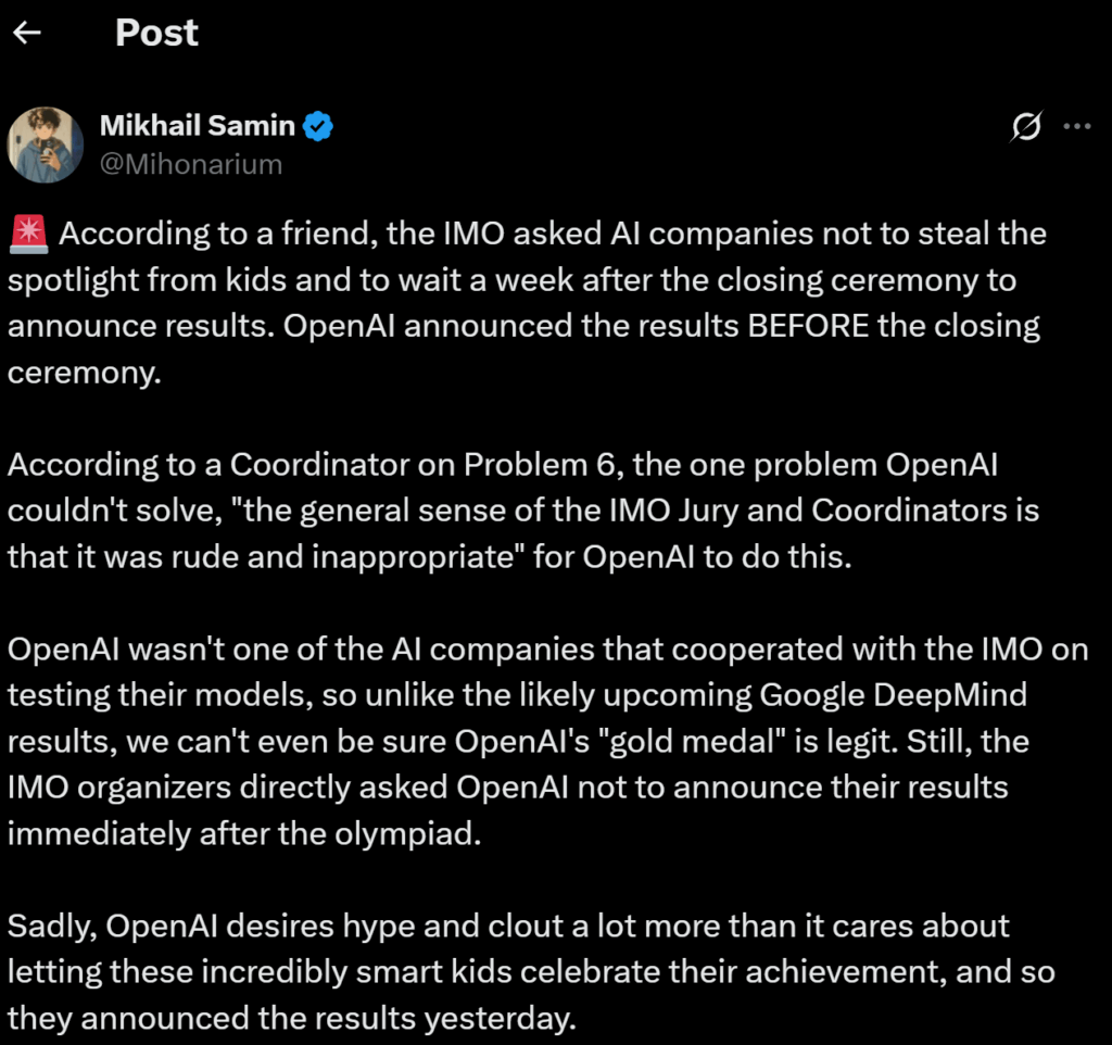 Вот только опять оказывается, что есть нюанс. По словам инсайдеров, организаторы IMO попросили все AI-компании не красть внимание у детей и подождать неделю после церемонии закрытия, прежде чем объявлять свои результаты:
