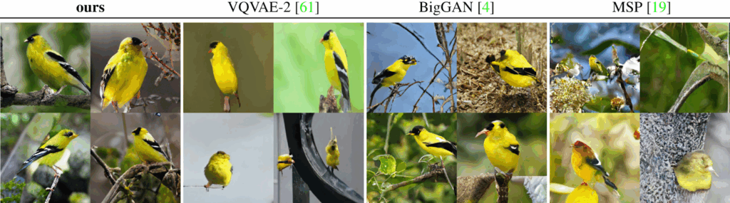 VQ-GAN could produce better images on the basic ImageNet—here are some first rate goldfinches compared to other approaches: