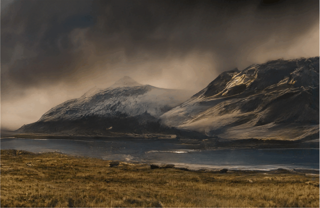 But a major point about VQ-GAN was that it could scale to far higher resolutions. Here is a sample landscape (originally 1280×832 pixels) generated by the VQ-GAN from a semantic layout, i.e., from a rough segmentation map showing where the sky, land, mountains, and grass should be:
