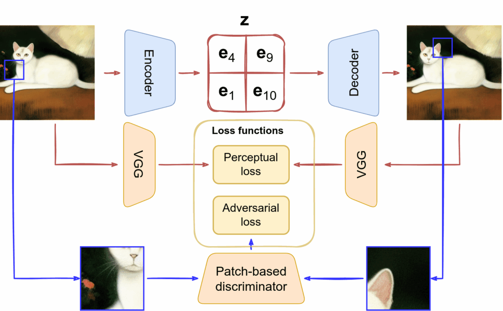 One of the problems here is that we need to learn a very rich and expressive codebook. So instead of using just a straightforward reconstruction loss, VQ-GAN (Esser et al., 2020) adds a patch-based discriminator that aims to distinguish between (small patches of) real and reconstructed images, and the loss becomes a perceptual loss, i.e., the difference between features extracted by some standard convolutional network (Zhang et al., 2018). This means that the discriminator now takes care of the local structure of the generate image, and the perceptual loss deals with the actual content.