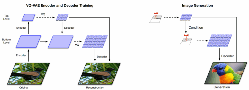 The next step was VQ-VAE 2 that still used PixelCNN for latent codes but moved to a hierarchical structure, generating a small top-level representation and then a more detailed bottom-level representation conditioned on the top level result: