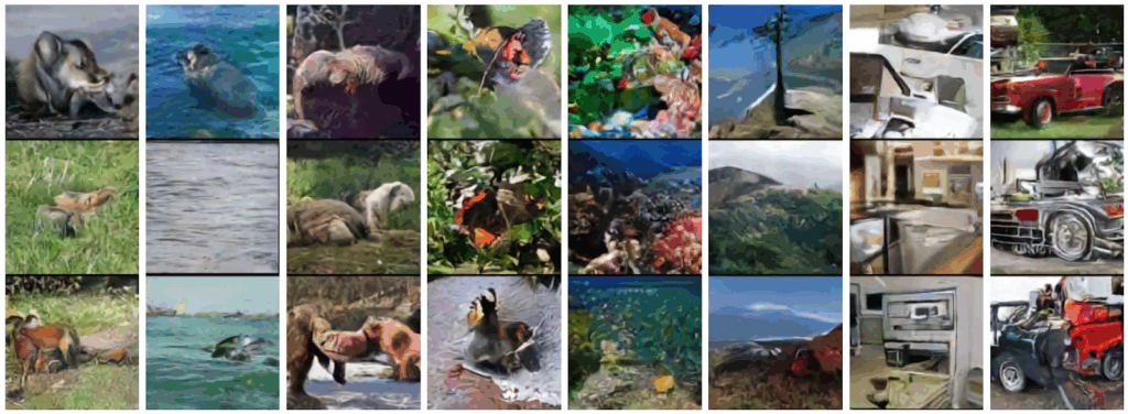 That’s it for VQ-VAE. The original model predated Transformers so it could not use them for latent code generation but they used a different autoregressive model which was state of the art at the time: PixelCNN (van den Oord et al., 2016; Salimans et al., 2017). PixelCNN itself originated as a model for generating pictures, but generating a high-resolution image autoregressively, pixel by pixel, is just way too slow (see also my first post in this series). But it’s just fine for generating a set of 32×32 codebook tokens! The original VQ-VAE, trained on ImageNet with a separate PixelCNN trained to generate latent codes, produced impressive results by 2017 standards: