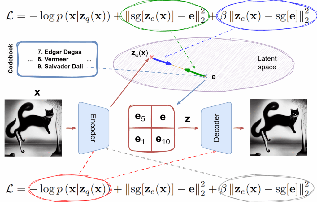 This picture mostly illustrates the idea of a discrete latent space with codebook vectors that we have already discussed. But it also shows the solution to the first problem: VQ-VAE simply copies the gradients (red line) from the decoder to the encoder, that is, the gradient of the loss function with respect to the tensor of codebook vectors is assumed to be its gradient with respect to Enc(x). This is an approximation, of course, and one can remove it with a more involved construction (a discrete VAE with the Gumbel-Softmax trick that we will explain in a later post on DALL-E), but for now it will have to do.