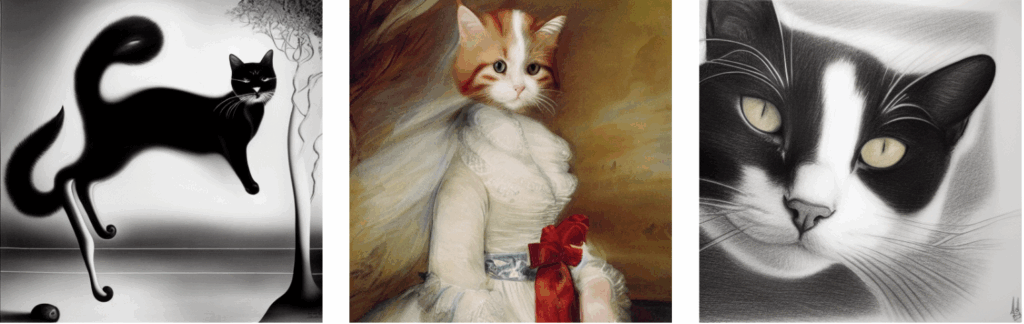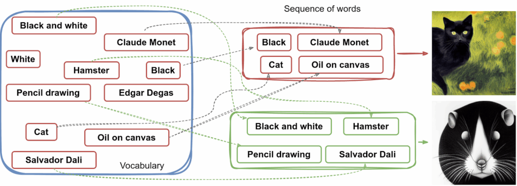 This is an appealing picture, but it’s not as easy to obtain, and, moreover, it’s not really how we think about styles and picture descriptions. We are verbal creatures, and when I want to get a picture of a black cat I don’t have a real number associated with its “blackness”, I just want a cat with a discrete “black” modifier, just like I might want a “white” modifier. A black and white cat for me is not a number that reflects the percentage of white hair but most probably just a separate “black and white” modifier that turns out to be in a rather complex relationship with the “black” and “white” modifiers.