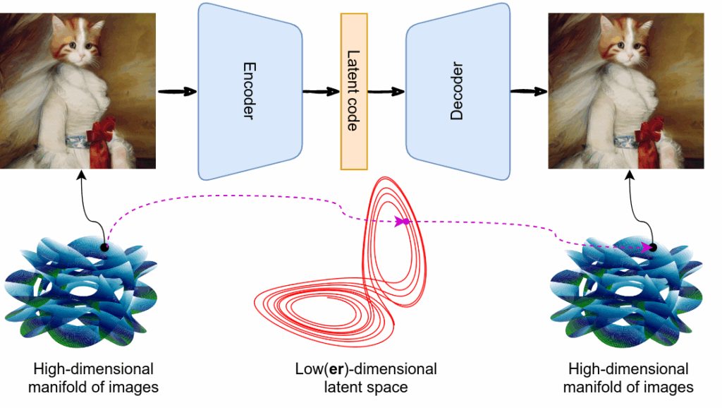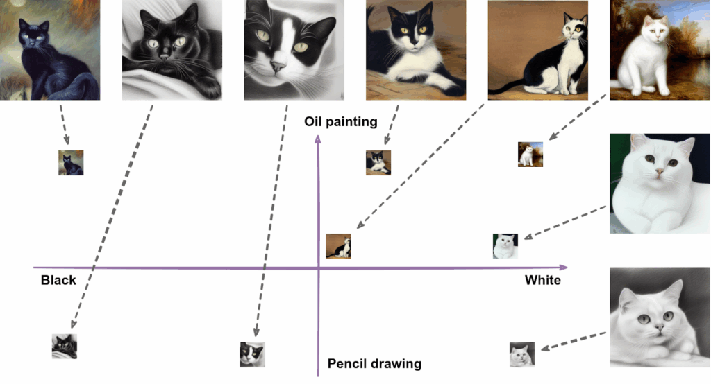 If the autoencoder is designed well, this may result in a latent space where certain directions correspond to specific properties of the image. For instance, if we are compressing cat images then one axis may correspond to the cat’s color and another to the overall style of the image: