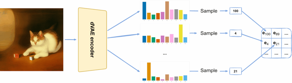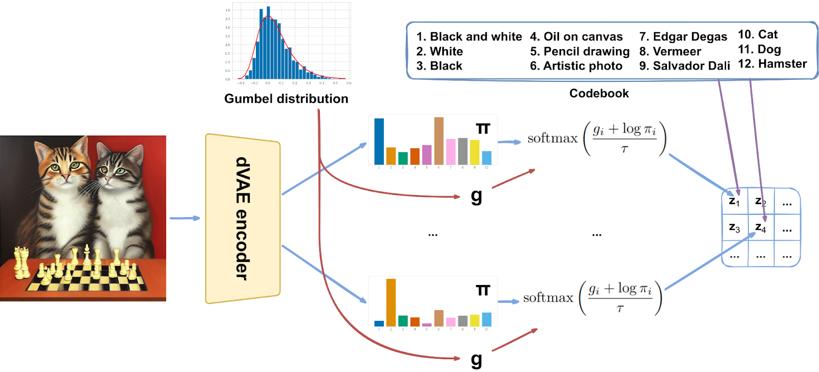 Discrete VAE used in DALL-E takes the next step: instead of outputting a latent vector that is then “rounded” to a codebook vector, it outputs a whole probability distribution over the codebook, probabilities for a “die” that then can be rolled to determine the actual vector: