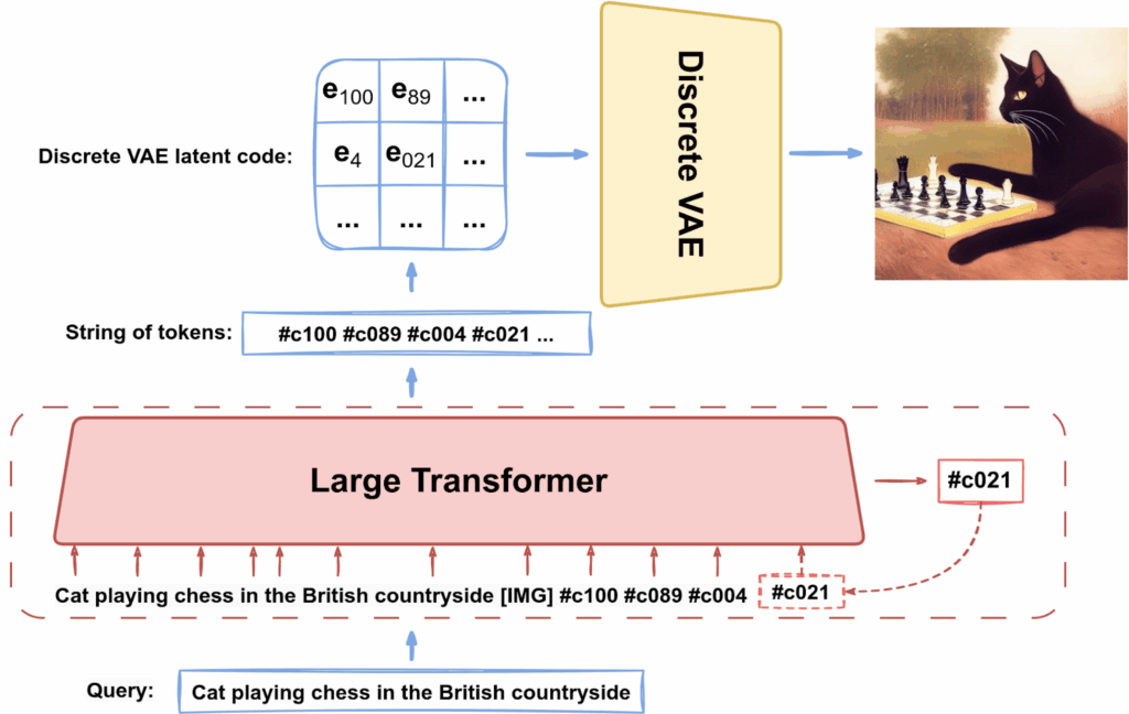 We only need to train a GPT-like model to generate the latent code as a sequence of special tokens that would continue a text description: “Cat playing chess in the British countryside [IMG] #c100 #c089 #c004 …”. Then we can run it with a text query followed by the special token “[IMG]”, and supposedly it will produce a sequence of latent codes for the discrete VAE. Naturally, this will require us to retrain (or fine-tune) a text Transformer on (image, text) pairs encoded in this way.