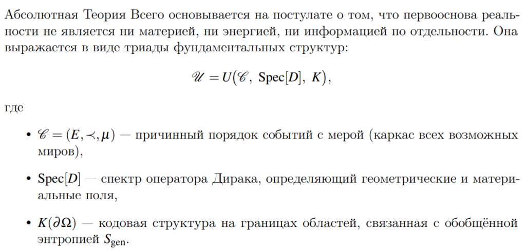 А второе — текст отчасти наукообразный, написанный в LaTeX, с некоторой псевдоматематической обвязкой к идеям этой абсолютной теории всего, с настоящими ссылками…