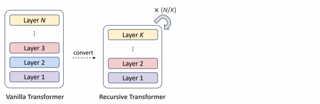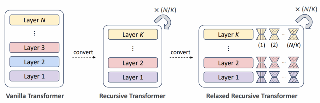 А если объединить связывание слоёв и ранние выходы, получатся рекурсивные трансформеры (Recursive Transformers, Bae et al., 2025b) — модели, которые повторяют один блок из K слоёв несколько раз, создавая зацикленную архитектуру. Например, вместо 30 уникальных слоёв в рекурсивной модели будет всего 10 слоёв, которые применяются трижды, что, соответственно, втрое сокращает число параметров: