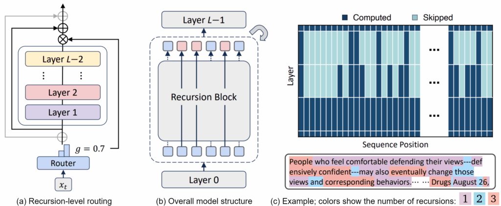 На иллюстрации ниже показаны (a) структура маршрутизатора, который может пропустить шаг рекурсии, (b) общая структура модели и (c) пример того, как более простые токены производятся меньшим числом шагов рекурсии, чем семантически богатые: