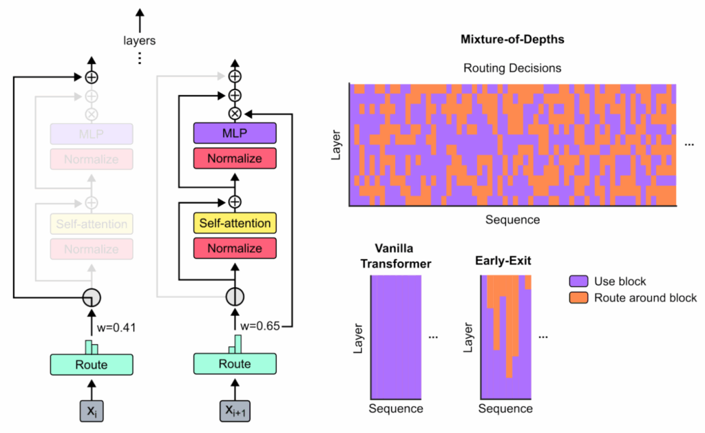 Первым важным предшественником этой работы стала идея Mixture-of-Depths, предложенная исследователями из Google DeepMind (Raposo et al., 2024). Они ввели маршрутизацию на уровне токенов для адаптивных вычислений. В то время как MoE-модели обучают маршрутизатор выбирать между разными подсетями (экспертами), Mixture-of-Depths обучает маршрутизатор выбирать, использовать ли слой или перейти непосредственно к остаточному соединению:
