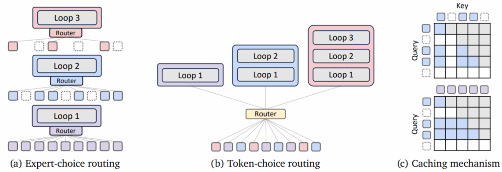 - expert-choice routing (маршрутизация с выбором экспертом) рассматривает каждую глубину рекурсии как “эксперта” и выбирает, какие токены он хочет обработат; этот подход гарантирует идеальную балансировку нагрузки (большая проблема для MoE-моделей: как вы убедите роутер не отправлять всё на одного и того же эксперта?), поскольку здесь каждая итерация цикла обрабатывает фиксированное количество токенов; но тут нужно долго возиться с причинностью (в смысле causality), чтобы правильно получилось авторегрессивное порождение токенов;