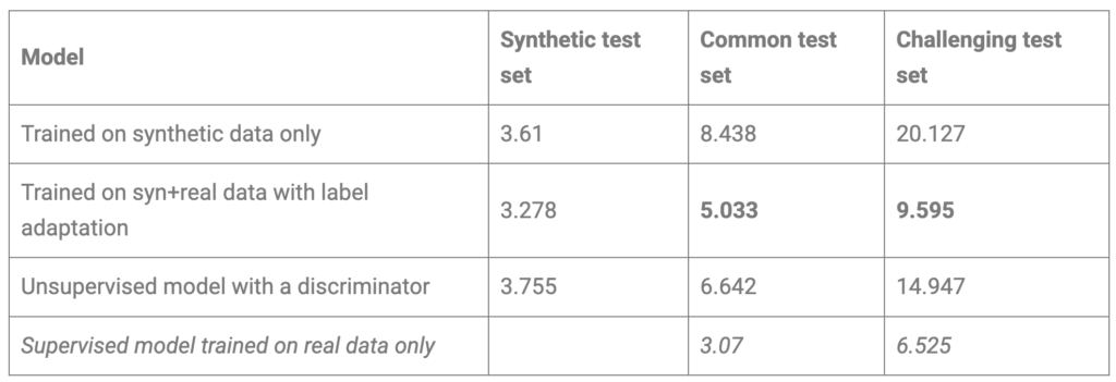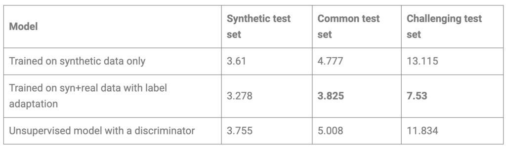 As you can see, this test-time label adaptation has improved the results across the board, and very significantly! However, they still don’t quite match the supervised model, so some further research into better label adaptation is still in order. The relative order of the model has remained more or less the same, and the mixed syn+real model with label adaptation done with a small U-Net-like architecture wins again, quite convincingly although with a smaller margin than before.