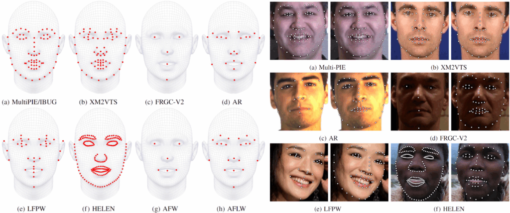 There are several different approaches to how to define facial landmarks; here is an illustration of no less than eight approaches from Sagonas et al. (2016) who introduced yet another standard: