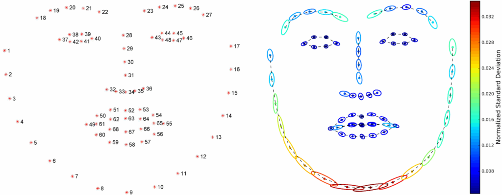 Their standard became one of the most widely used in industry. Named iBug68, it consists of 68 facial landmarks defined as follows (the left part shows the definitions, and the right part shows the variance of landmark points as captured by human annotators):