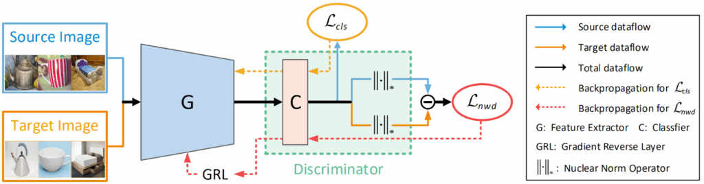 DALN suggested a third option for adversarial UDA: it trains only one classifier, with no additional discriminators, and reuse the classifier as a discriminator. The resulting loss function is a combination of a regular classification loss on the source domain and a special adversarial loss on the target domain that is minimized by the model and maximized by the classifier’s weights:
