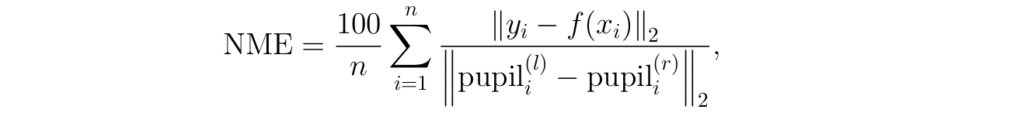 where n is the number of landmarks, yi are the ground truth landmark positions, f(xi) are the landmark positions predicted by the model, and pupil are the positions of the left and right pupil of the face in question (this is the normalization coefficient). The coefficient 100 is introduced simply to make the numbers easier to read.