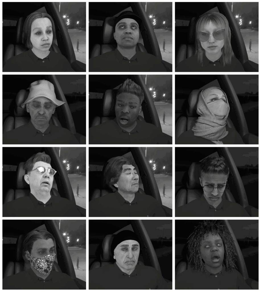 To make this work, we will need to make an additional effort to model car interiors, cameras used by car manufacturers, and other environmental features, but the heart of this project remains in the FaceAPI that we have already developed. This easy-to-use API can produce millions of unique 3D models that have different combinations of identities, clothing, accessories, and, importantly for this project, facial expressions. FaceAPI is already able to produce a wide variety of emotions, including, of course, closed eyes and drowsiness, but we plan to further expand this feature set.