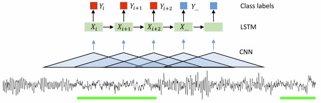 The gold standard of recognizing brain states such as sleep is, of course, electroencephalography (EEG), that is, measuring the electrical activity of your brain. Recent research has applied deep learning to analyzing EEG data, and it appears that even relatively simple solutions based on convolutional and recurrent networks are enough to recognize sleep and drowsiness with high certainty. For instance, a recent work by Zurich researchers Malafeev et al. (2020) shows excellent results in the detection of microsleep episodes with a simple architecture like this: