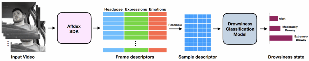 Another important recent work comes from Affectiva, a company we have recently collaborated with on eye gaze estimation. Joshi et al. (2020) classify drowsiness based on facial expressions as captured in a 10-second video that might have the driver progress between different states of drowsiness. Their pipeline is based on features extracted by their own SDK for recognizing facial expressions: