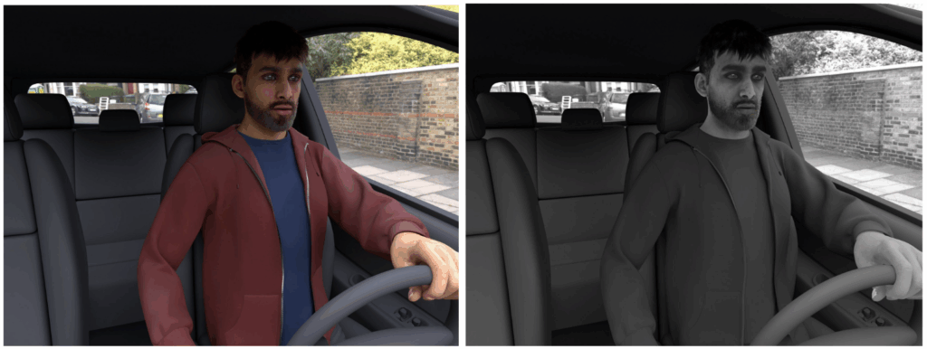 Obviously, all of these problems belong to the field of computer vision, and all standard arguments for the use of synthetic data apply in this case as well. Thus, we expect that synthetic data produced by our engines will be extremely useful for driver attention monitoring.In the next example, also produced by FaceAPI, we can compare a regular RGB image and the corresponding near-infrared image for two drivers who may be distracted. Note that eye gaze is also clearly seen in our synthetic pictures, as well as larger features: